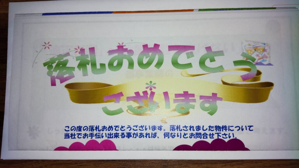 落札して所有権移転したときに、とある落札した地域の不動産屋さんから届いた封書です。