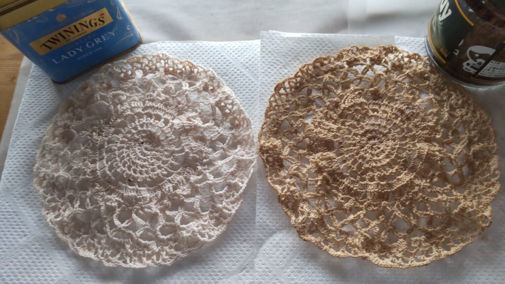 以前やっていた旧Twitter現Xでフォロワー様から、レース編み染めを教えていただいて作ってみたドイリーのレース編みです。
